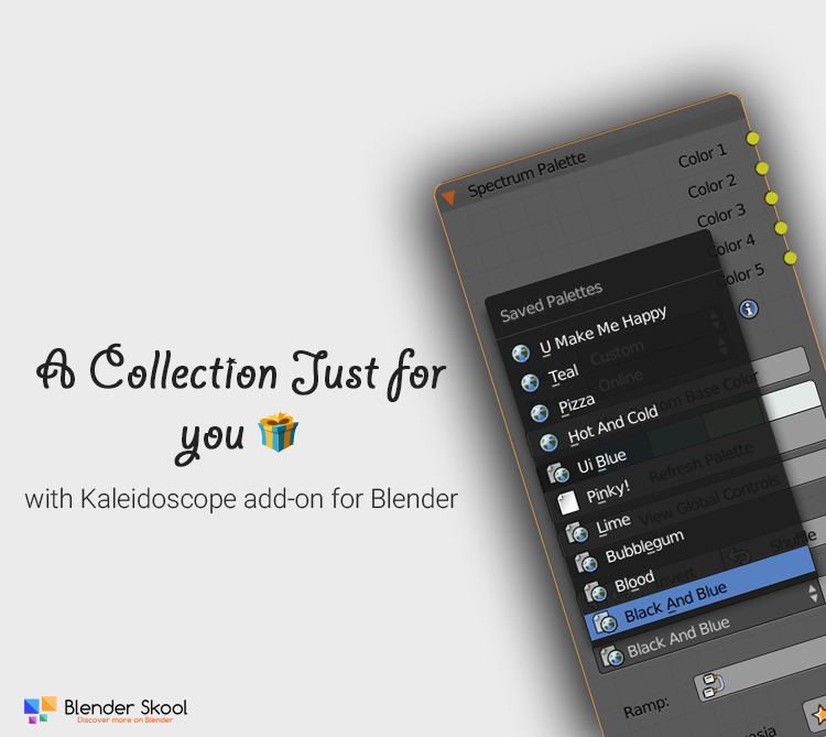 The Spectrum Node of the add-on allows you to generate and use color palettes directly inside Blender. Just connect the colors to the nodes, and then you can manage the palette directly through the Spectrum node. It is global for every scene, so if you change in one material, the node updates for all the materials.